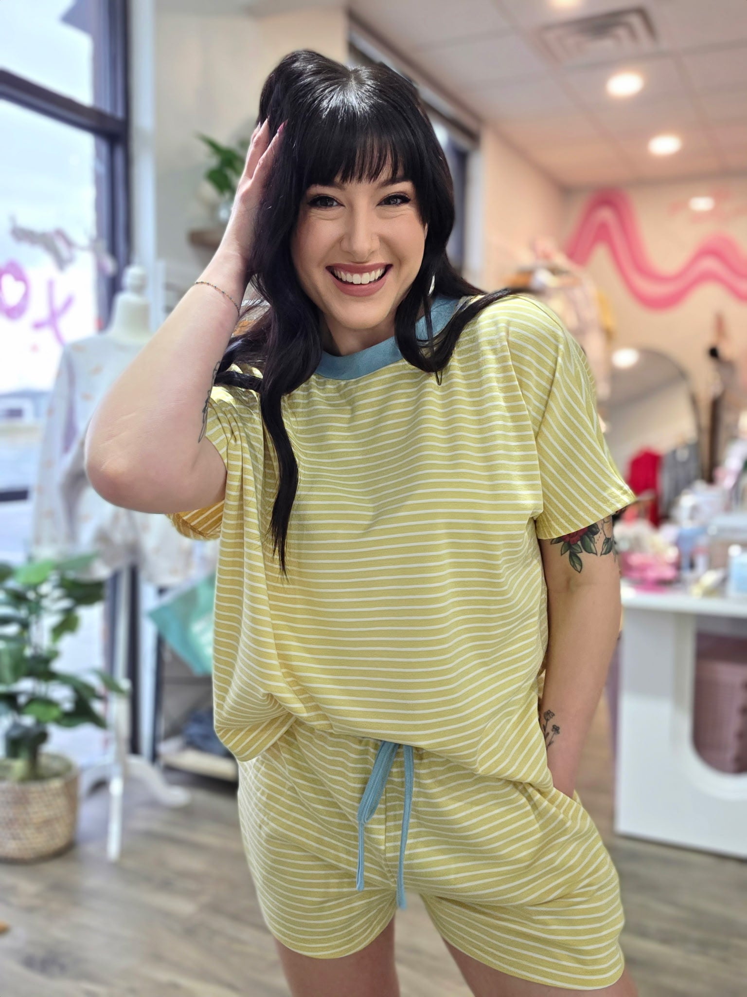 Kick back in style with our Striped Lounge Set, featuring a comfy knit top and shorts that scream "weekend vibes!" With a loose fit and playful stripes, you'll be lounging like a pro (or should we say, a lounge-ologist?). The elasticized waist and contrast drawstring keep things snug but chill—perfect for Netflix marathons or snack attacks!