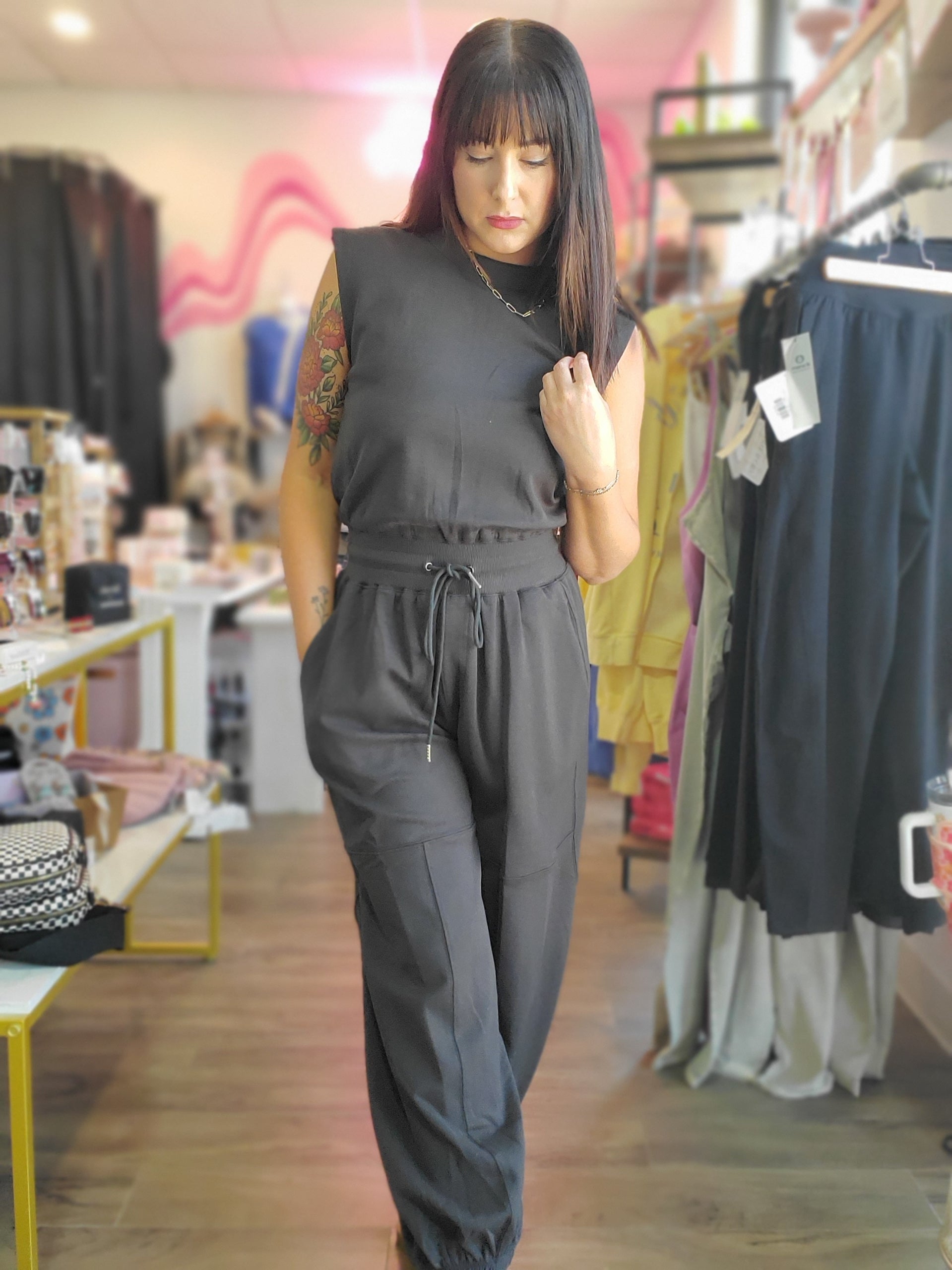 Get ready to jump into fun and comfort with this sleeveless knit jumpsuit. The drawstring waist allows for customizable fit, while the knit fabric keeps you active and stylish. Versatile for any occasion, this jumpsuit will become your go-to outfit in no time!