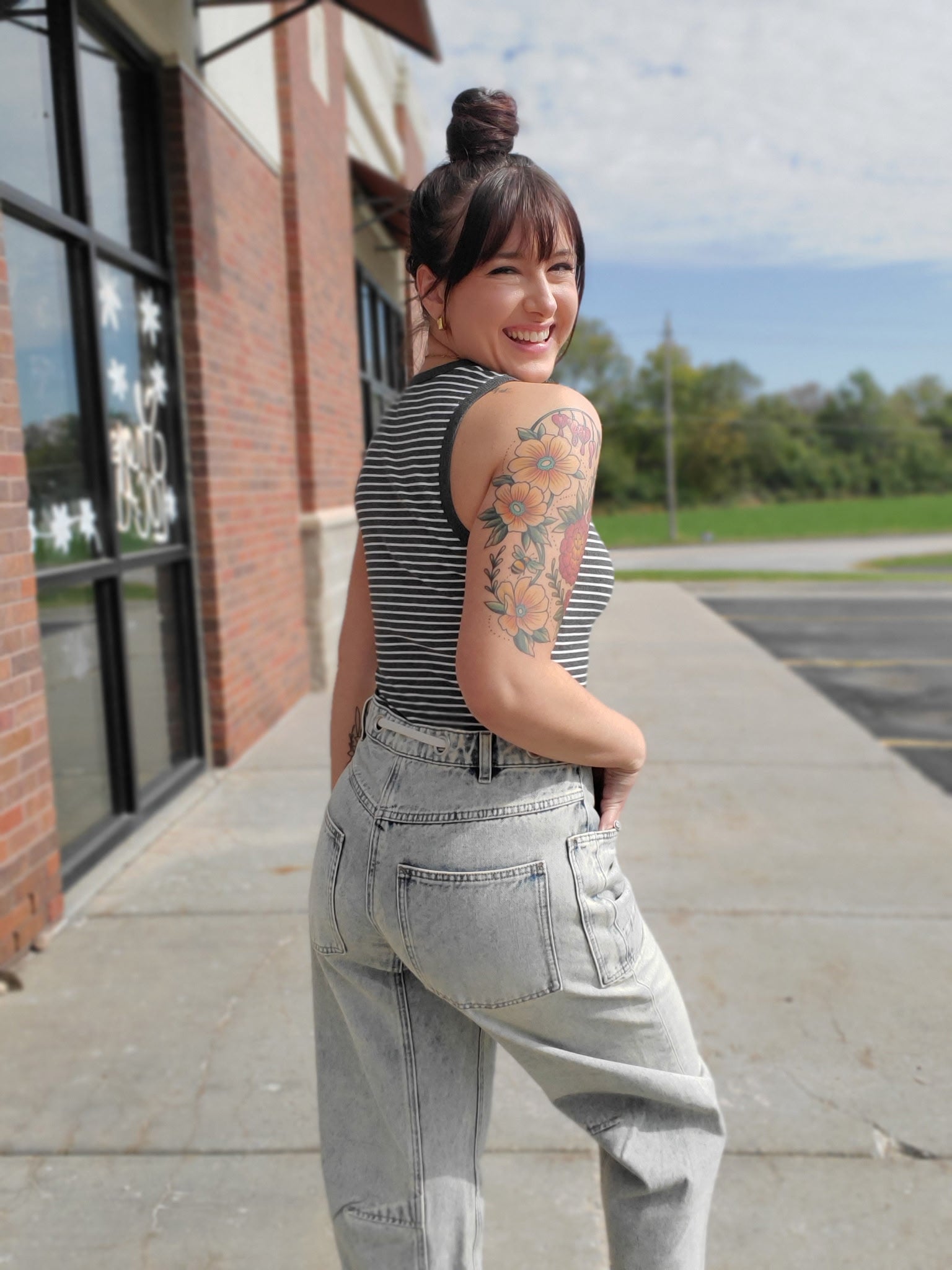 "Show off your playful side in our Sleeveless Stripe Bodysuit. With a round neck and sleeveless design, this bodysuit is perfect for any occasion. The stripes add a touch of whimsy, making you stand out in the best way possible. Don't miss out on this quirky and fun addition to your wardrobe!"