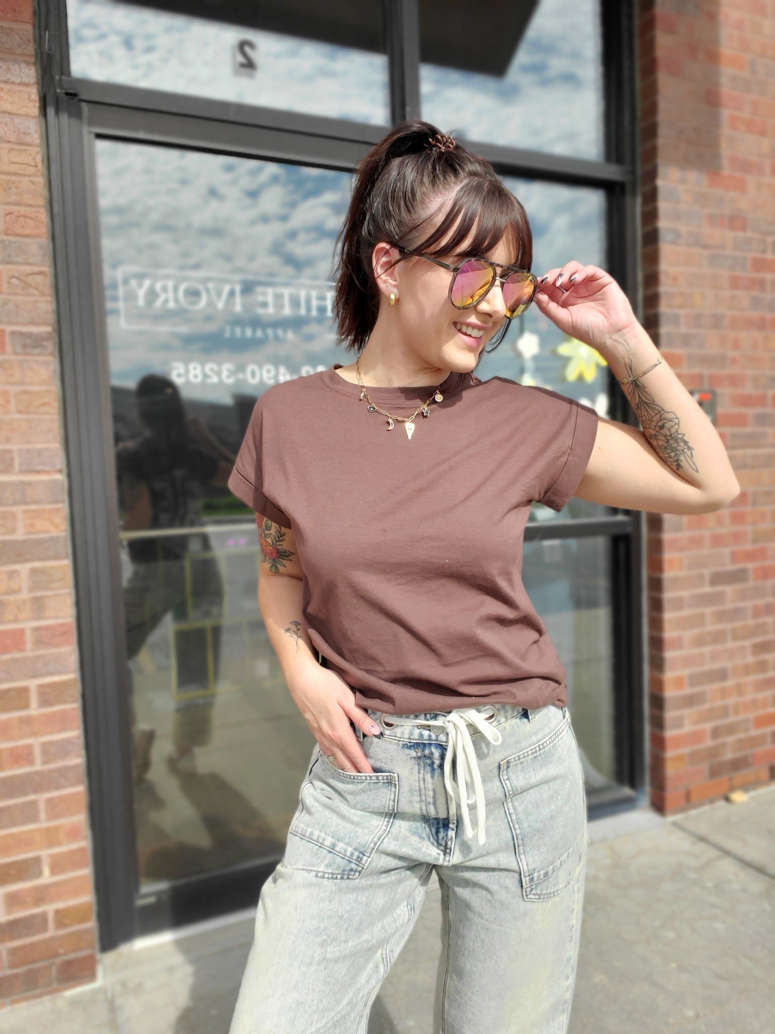 This basic folded sleeve tee is crafted from high-quality cotton, providing comfort and durability. The folded sleeves add a touch of style to this essential wardrobe piece. Made from 100% cotton, this tee is perfect for everyday wear, making it a versatile and practical addition to any wardrobe.